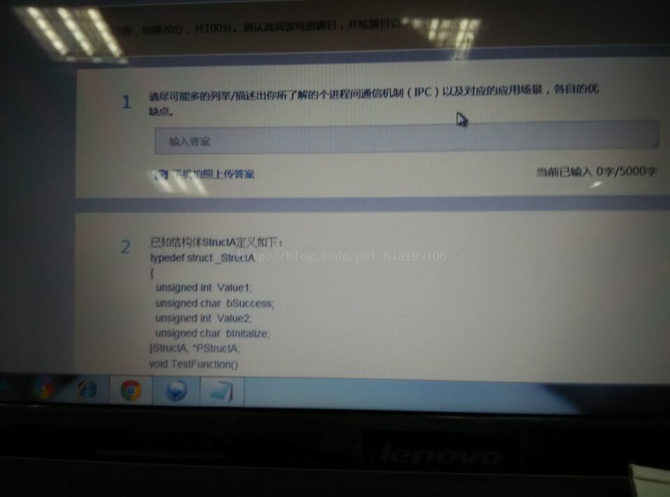 2015年3月28号腾讯笔试,武汉地区形式是在线考试,各地区形式和时间略有不同,具体看腾讯招聘官网,在线考试前有一次统一模拟在线考试的机会!正式考试时60分钟30个选择题,不定选。60分钟,5道大题。加起来120分钟。而且每提交一题不能返回修改(比较坑)。至于在线考翻书、或是上网搜答案,每个人有自己的做法,当然腾讯也有所防范,就是参与在线考试的机子必须要开通摄像头,且退出答题界面的次数不能超过10次(当然你可以用手机搜答案或是一台电脑考试,另一台搜答案),不过建议大家还是靠实力,被发现作弊是没有资格进行招聘的下面环节的。选择题考的内容网上搜有一堆,大体集中在数据结构,算法,TCP/ip(网络),计算机操作系统,c++,设计模式,编译原理,推理题等,想刷题可找往年题库http://www.itpub.net/thread-1822707-1-1.html。选择题部分15年没记住太多。大题倒是冒死拍了几张照片。