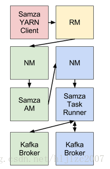 Samza客户端告诉YARN的Resouce Manager,它想启动一个Samza job, YARN RM 告诉YARN Node manager,分配空间给YARN ApplicationMaster,NM指定完空间后,YARN container会运行Samza Task Runner。