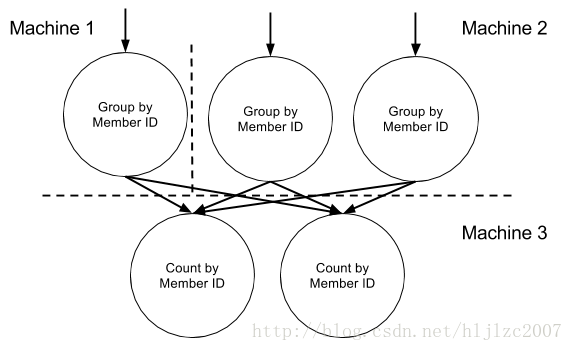 下图是Samza官方给的一例子,根据Member ID分组,计算页面访问次数。入口消息分别来自Machine1、2,出口是Machine3,我们可以这样理解,消息分散在不同的消息系统中(Kafka),Samza从不同的Kafka中读取topic,在将topic进行处理后,发送到Machine3,这里不做过多分解,具体可以参照官方文档。