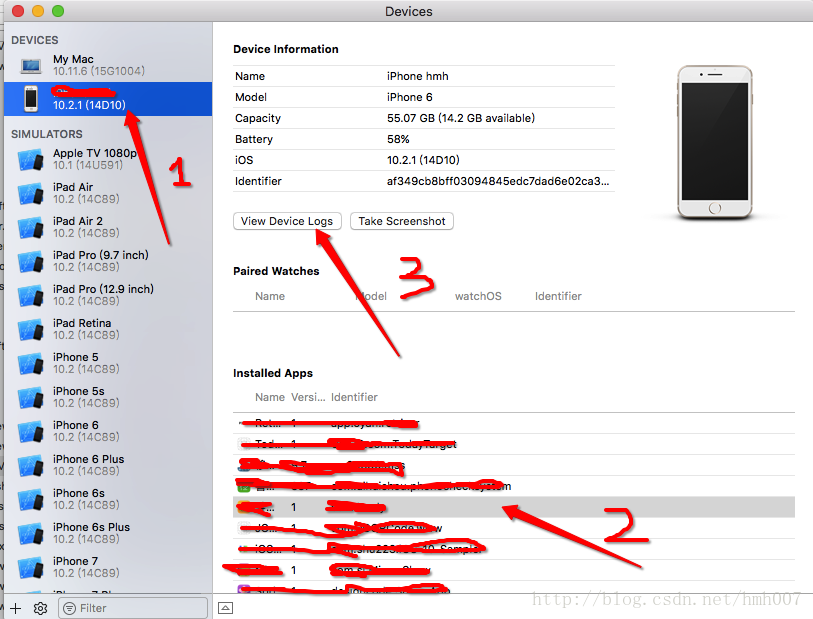 。。。 只是提示捕获了异常,然而并没有具体的信息,Xcode也没有定位到底是哪一行出错的。。。这就尴尬了。于是,我想到了崩溃日志。 怎么查看?很简单,将自己的iPhone连接到mac上,然后点击下图的位置: