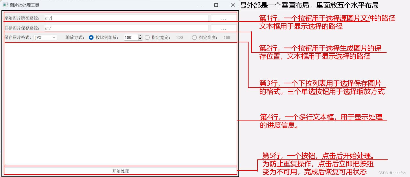 利用python的pillow组件开发一个图片批处理工具 提供了强大的图像处理功能,包括改变图像大小,旋转图像,图像格式转换,色场空间转换,图像增强,直方图处理,插值和滤波等等。图片绽放的方式有三种,一是按指定比例缩放,二是按指定宽度缩放(根据原始图片自动计算高度),三是按指定高度计算(根据原始图片自动计算宽度),在选择某一个缩放方式后,只让对应的控件可用,其它两个不可用。因图片的处理耗时比较长,为了能在多行文本框中及时反馈处理进度和处理信息,我们在新线程中进行图片处理,根据处理进度,不断向主线程反馈,并在多行文本框中显示处理进程,如下图。