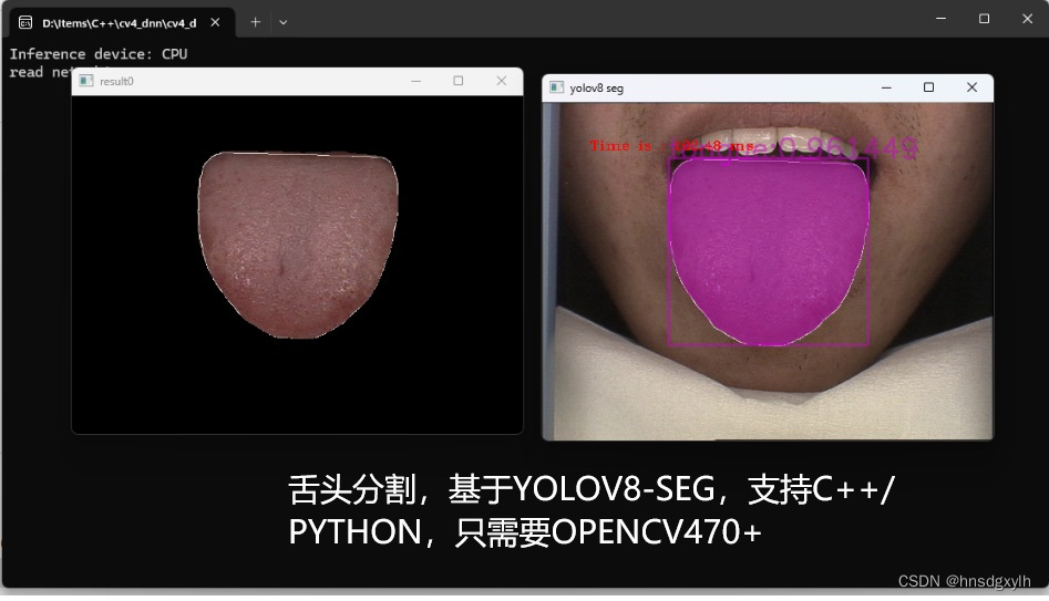 本文介绍了如何使用YOLOV8-SEG训练得到一个PT模型,将其转换为ONNX格式,以便OPENCV的DNN调用,实现对舌头分割的支持,同时支持C++、Python和Android等多种开发环境,摆脱对YOLO的依赖。