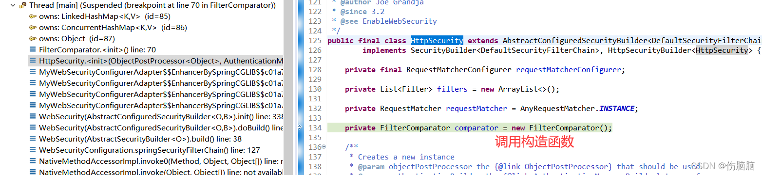 WebSecurity 设置 HttpSecurity,HttpSecurity 类加载的时候,成员属性初始化 new FilterComparator () ,最后 FilterComparator 这个类的构造函数触发了。