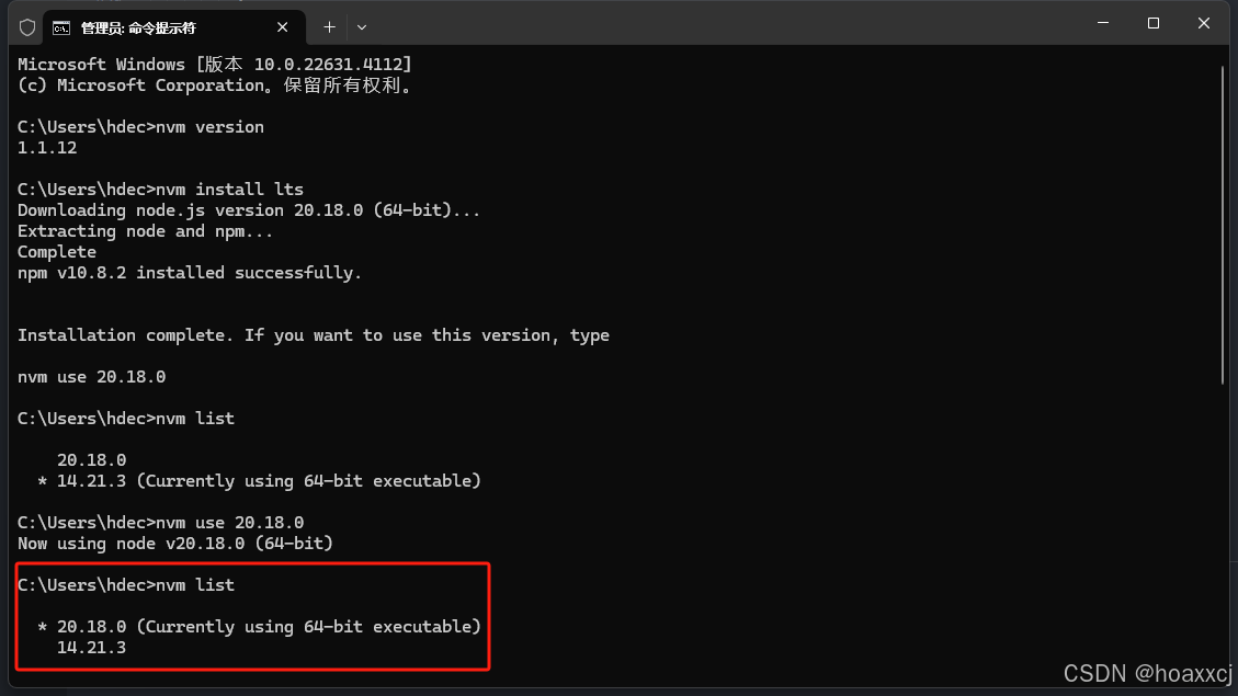 通过nvm install lts安装最新稳定版node.js,或者nvm install latest安装最新版node.js。切换到新安装的node.js后需要重新安装yarn:npm install -g yarn。安装完毕后可以通过nvm list查看当前存在以及使用中的node.js版本。通过nvm use 20.18.0切换到已安装的对应版本的node.js。有时候无法访问,可以直接下载上面安装包。