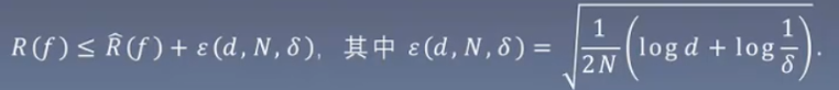 泛化误差上界:对于二分类问题,当假设空间是有限个函数的集合F = {f1,f2,...,fd}时,对任意一个函数f属于F,至少以概率