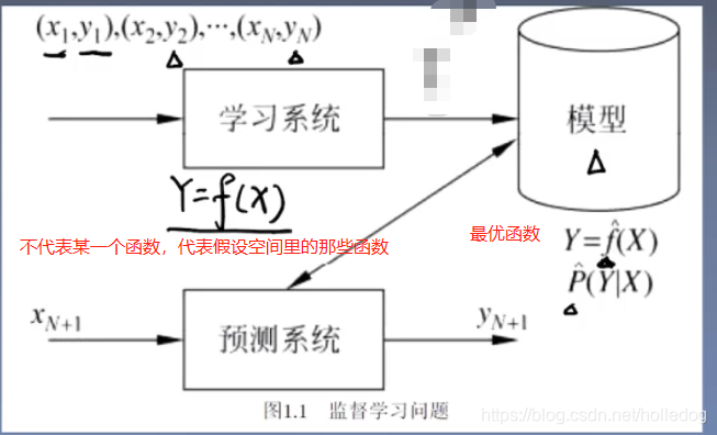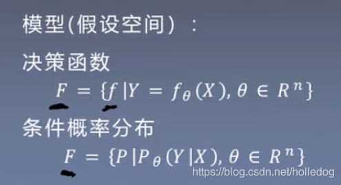 假设空间: 假设空间中就是一个个备选模型,然后从备选模型中选一个最优模型。模型形式分为决策函数Y=f(x) 和条件概率分布P(y|x)。