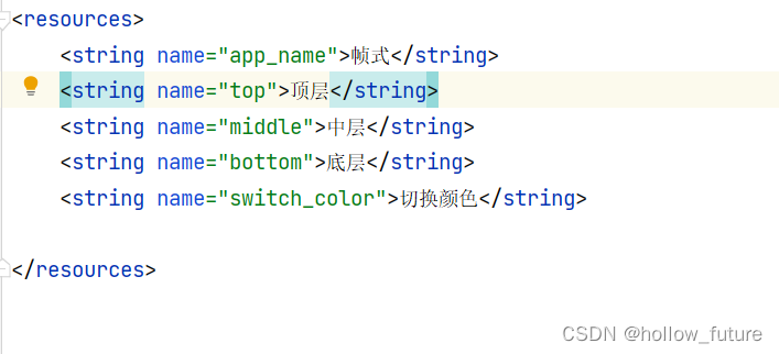 打开字符串资源文件strings.xml输入:
