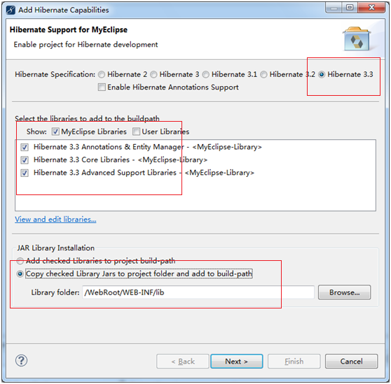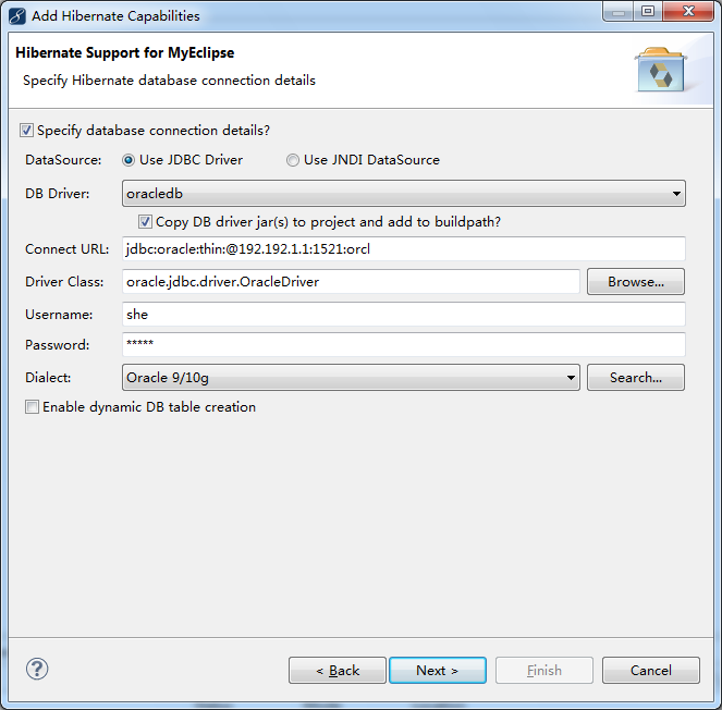 这两个一定要选择,否则myeclipse不能给你生成一对多、多对多等映射,如果只想生成单项映射,可以去掉一个,一般我们都选择,双项映射。