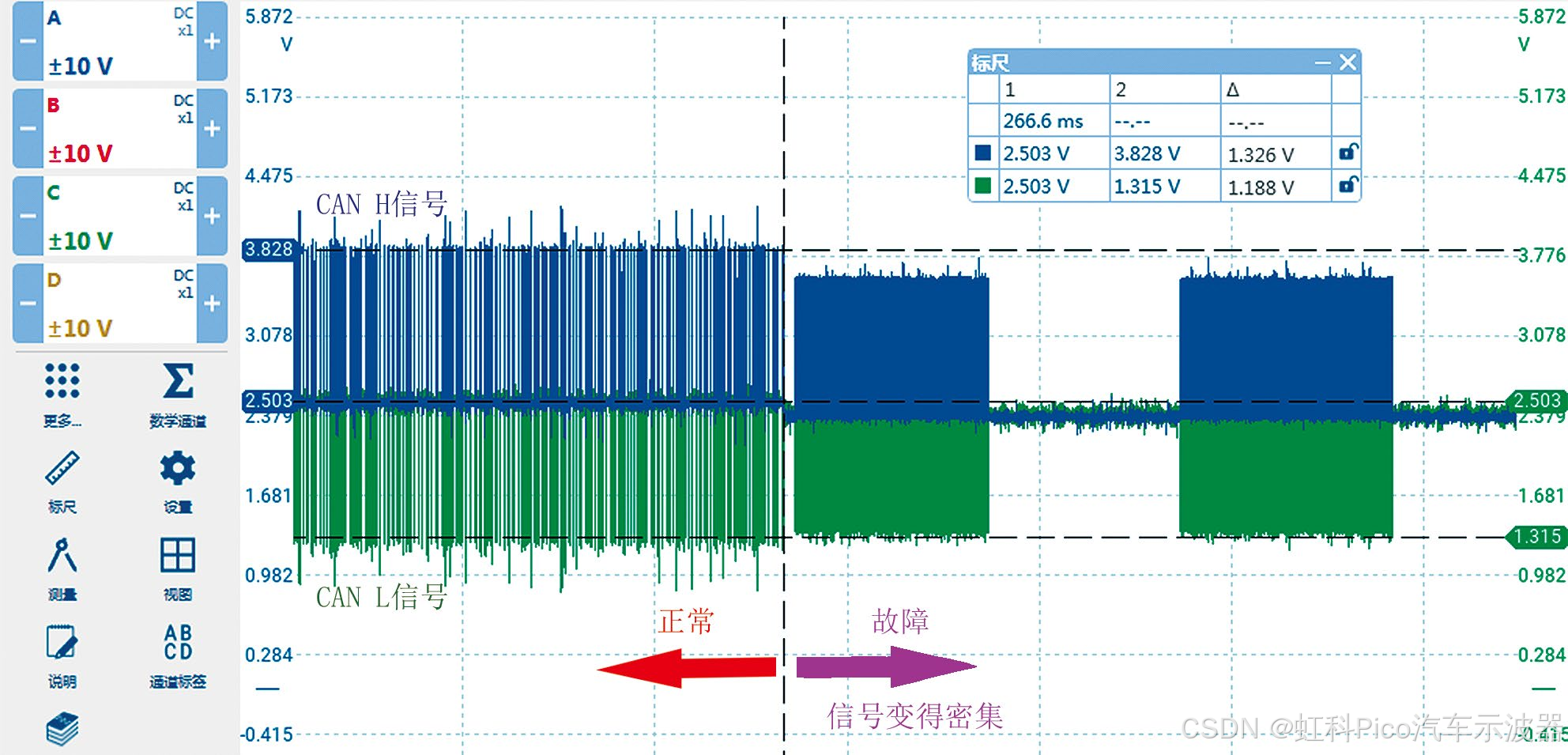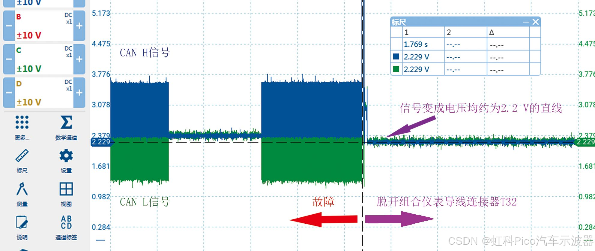 图4 组合仪表CAN总线的信号波形变成了2条直线