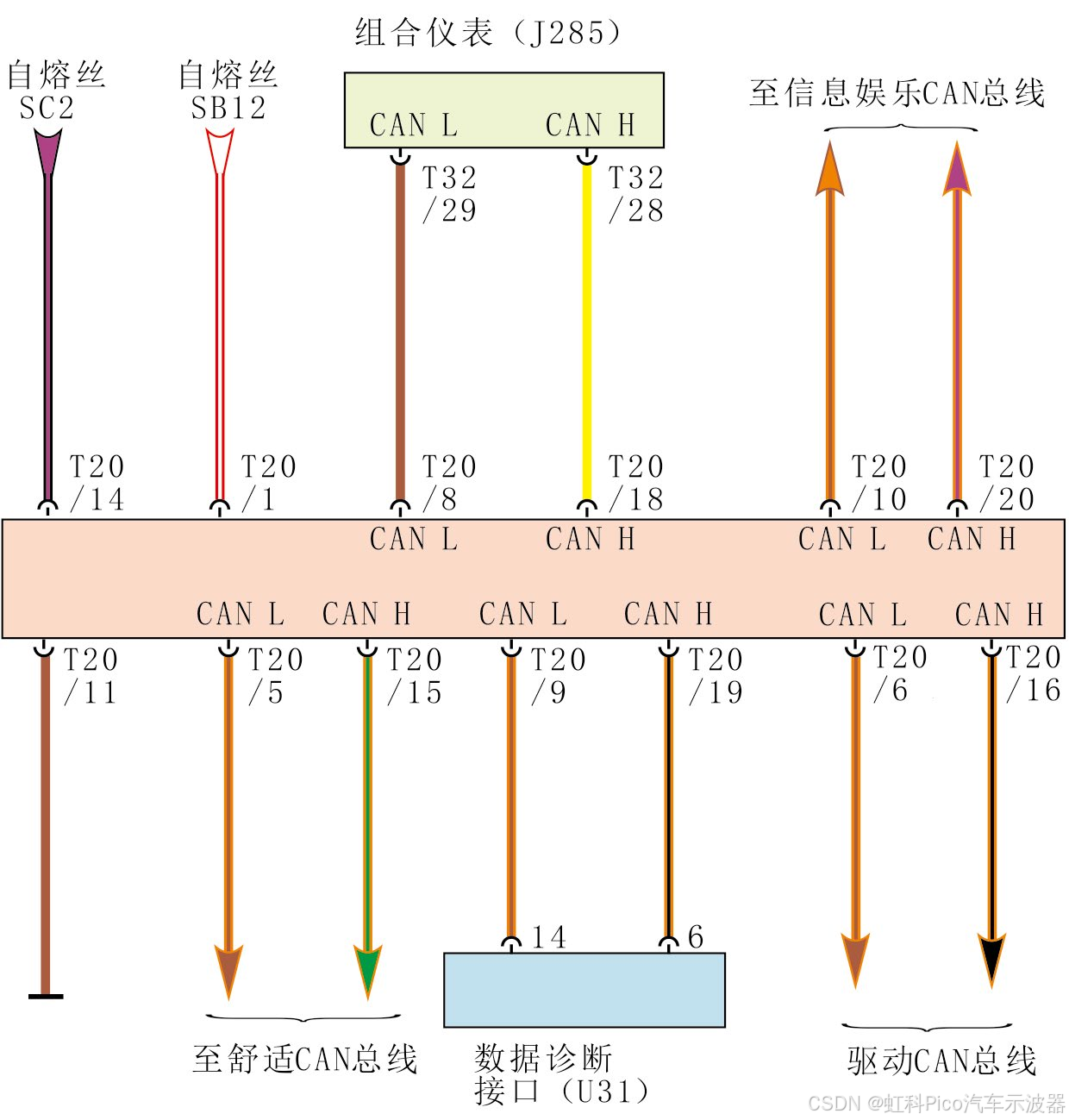 查看相关电路(图1)得知,网关(J533)上共有5组CAN总线,分别为驱动CAN总线、舒适CAN总线、信息娱乐CAN总线、诊断CAN总线及组合仪表CAN总线。