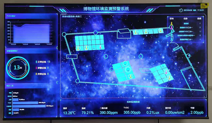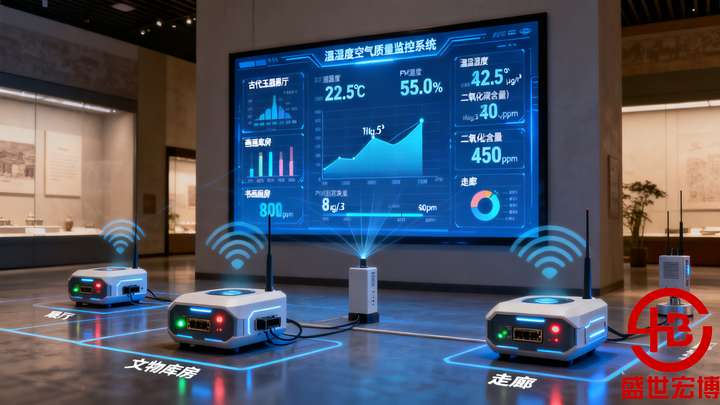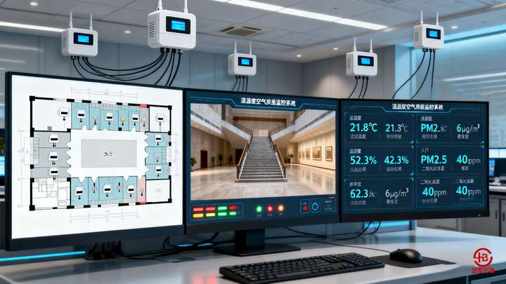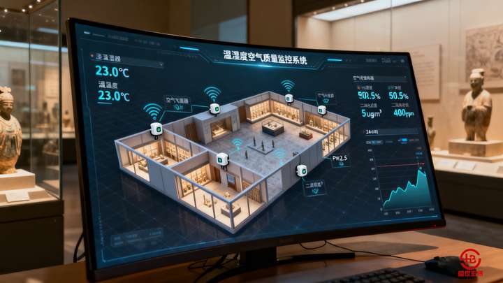 1. 多参数传感器网络 在展厅、库房及通风管道部署温湿度、PM2.5、VOCs、CO₂传感器,形成网格化监测体系。传感器需满足高精度(如温湿度误差±0.5℃/±2%RH)、低延迟(数据更新周期≤1分钟)要求。