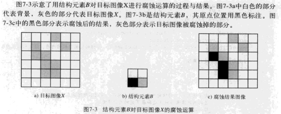 腐蚀运算的含义:每当在目标图像中找到一个与结构元素相同的子图像时,就把该子图像中与结构元素的原点位置对应的那个像素位置标注出来,目标图像上被标注出来的所有像素组成的集合,即为腐蚀运算的结果。其实质就是在目标图像中标出那些与结构元素相同的子图像的原点位置的像素。
