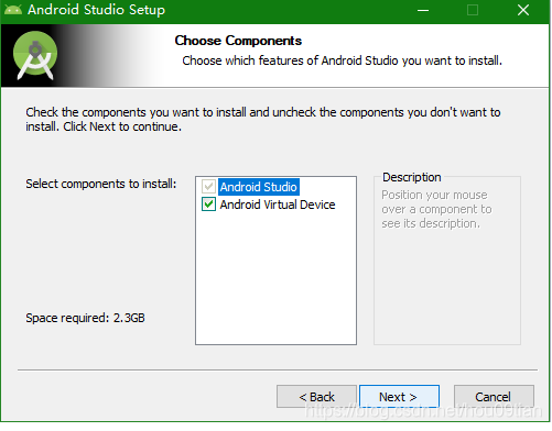 之后,在选择要安装的组件对话框中,选中“Android Virtual Device”,如图2所示,并按下“Next”按键。