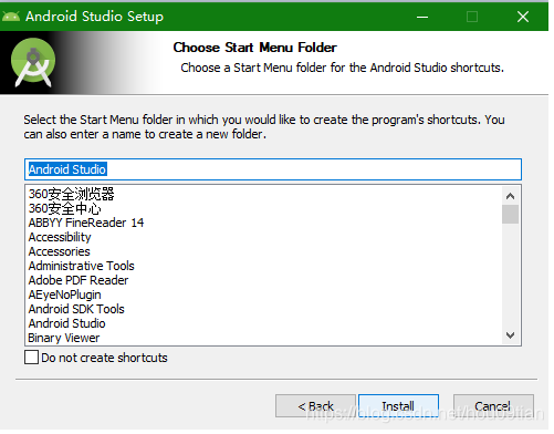 接下来在“选择开始菜单文件夹”的对话框中设置Android Studio在开始菜单中的名字,在这里使用默认的“Android Studio”即可,并且按下“Install”按键,如图4所示。