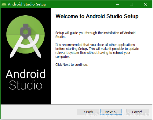 下载好Android Studio安装程序,双击之后,弹出如图1的对话框,点击“Next”按键开始安装。