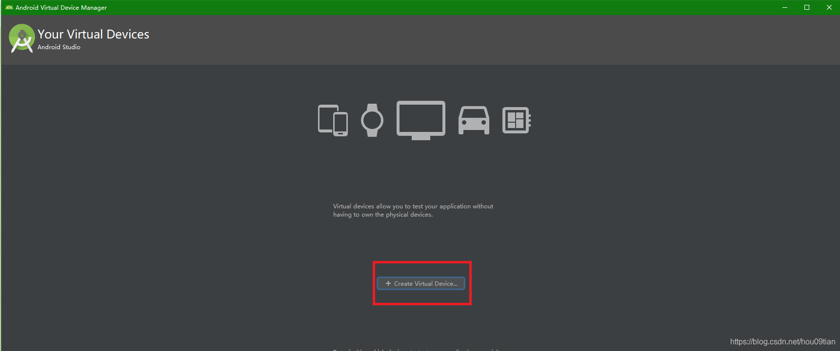 首先,在Android Studio的工具栏中选择“AVD Manager”按键。其中,AVD是Android Virtual Device的缩写,即安卓虚拟设备。在弹出的窗口中点击“Create Virtual Device”,创建虚拟设备按键,如图1所示。