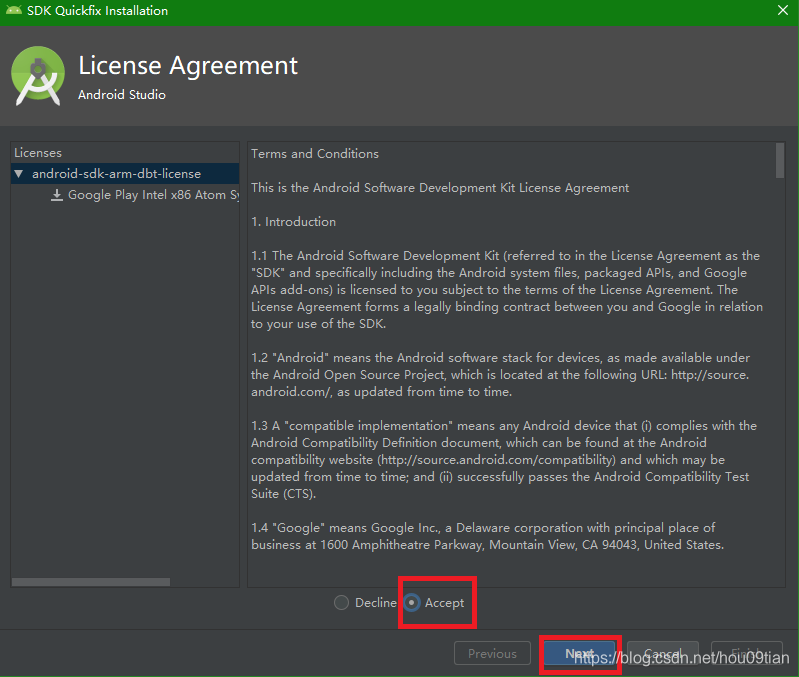 在此,我们选择“API 30”的“Download”,弹出安装SDK的窗口,如图4所示,该窗口中显示的是下载SDK的许可证协议,点击“Accept”(接受)按键,并且点击“Next”按键,进行下一步处理。
