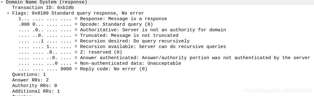 应答数据包中的Header含义与“3.1 Header部分”中提到的查询数据包中的Header含义相同。从图6中可以看到,其ID值与图3中的查询数据包的ID相同。在ID之后的Flags中可以可以看到,QR位的值是1,表示应答包;AA位是0,表示该应答不是来自权威服务器;RA为的值是1,表示服务器支持递归查询;其他标志位与查询数据相同。QDCOUNT(Question)段的值是1,说明有1个查询;ANCOUNT(Answer RRs)段的值是2,说明有2个应答数据;NSCOUNT(Authority RRs)段的值是0,表示没有授权资源;ARCOUNT(Additional RRs)段的值是1,说明有1个附加资源。