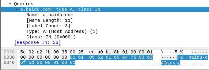 本次要查询的子域名是“a.baidu.com”的A记录,因此,在QNAME中将要查询的子域名分为三个部分“a”、“baidu”和“com”。从图6下部的数据中可以看到,首先是表示该第一个子域名长度的1个字节,其值是0x01,之后是表示该子域名“a”;之后是第二个子域名的长度0x05,之后是该子域名“baidu”;接下来是第三个子域名的长度0x03,之后是该子域名“com”,最后是表示结束的0x00。