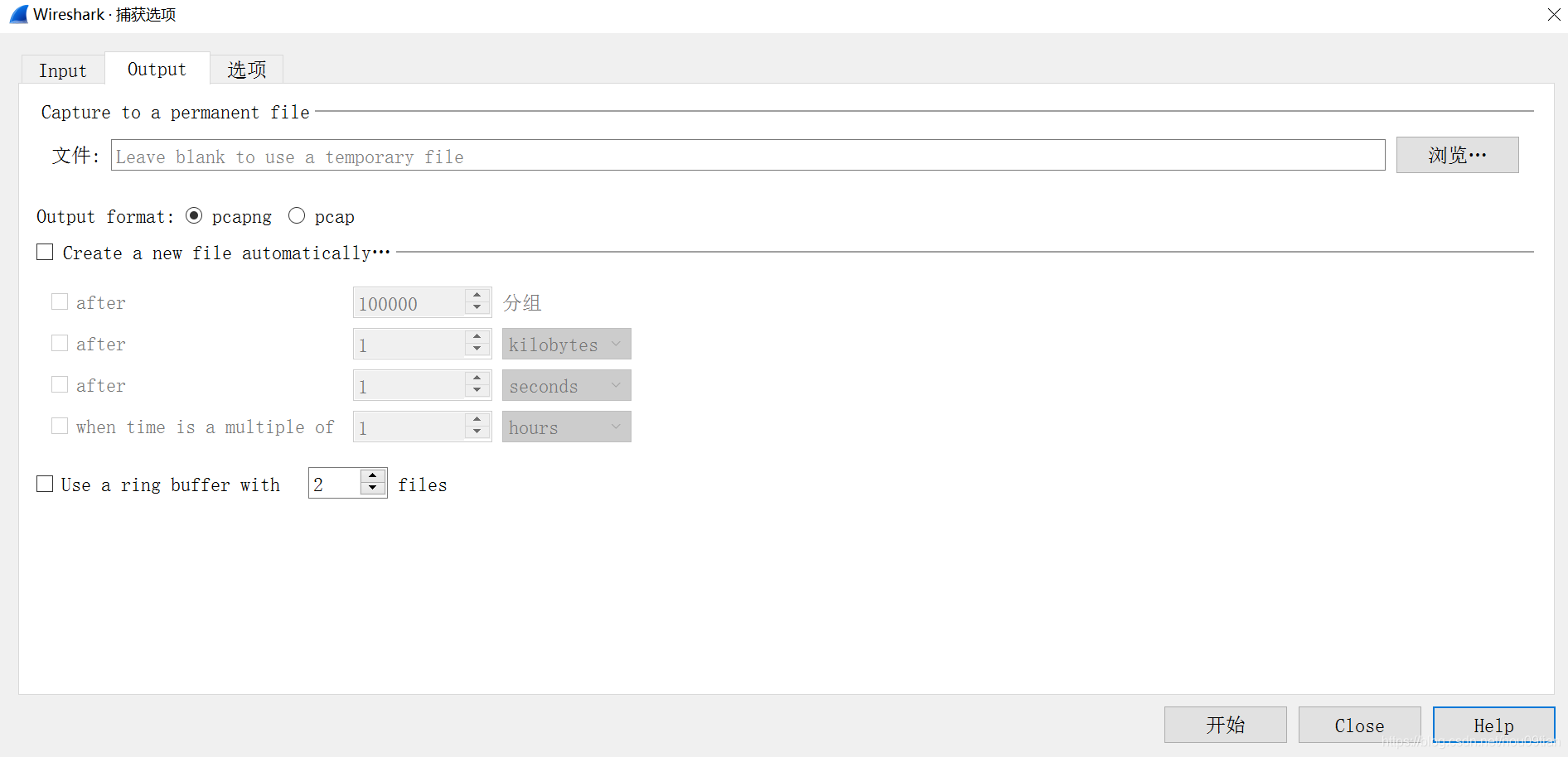 图9中的“Output format”表示输出格式,即用什么格式的文件来保存数据。有两种格式可以选择,pcapng和pcap。pcap格式是常用的网络数据报存储格式,数据是按照特定的格式进行存储的;pcapng是pcap Next Generation的简写,即pcap下一代文件格式,其保存数据的格式比pcap复杂。默认的文件格式是pcapng。