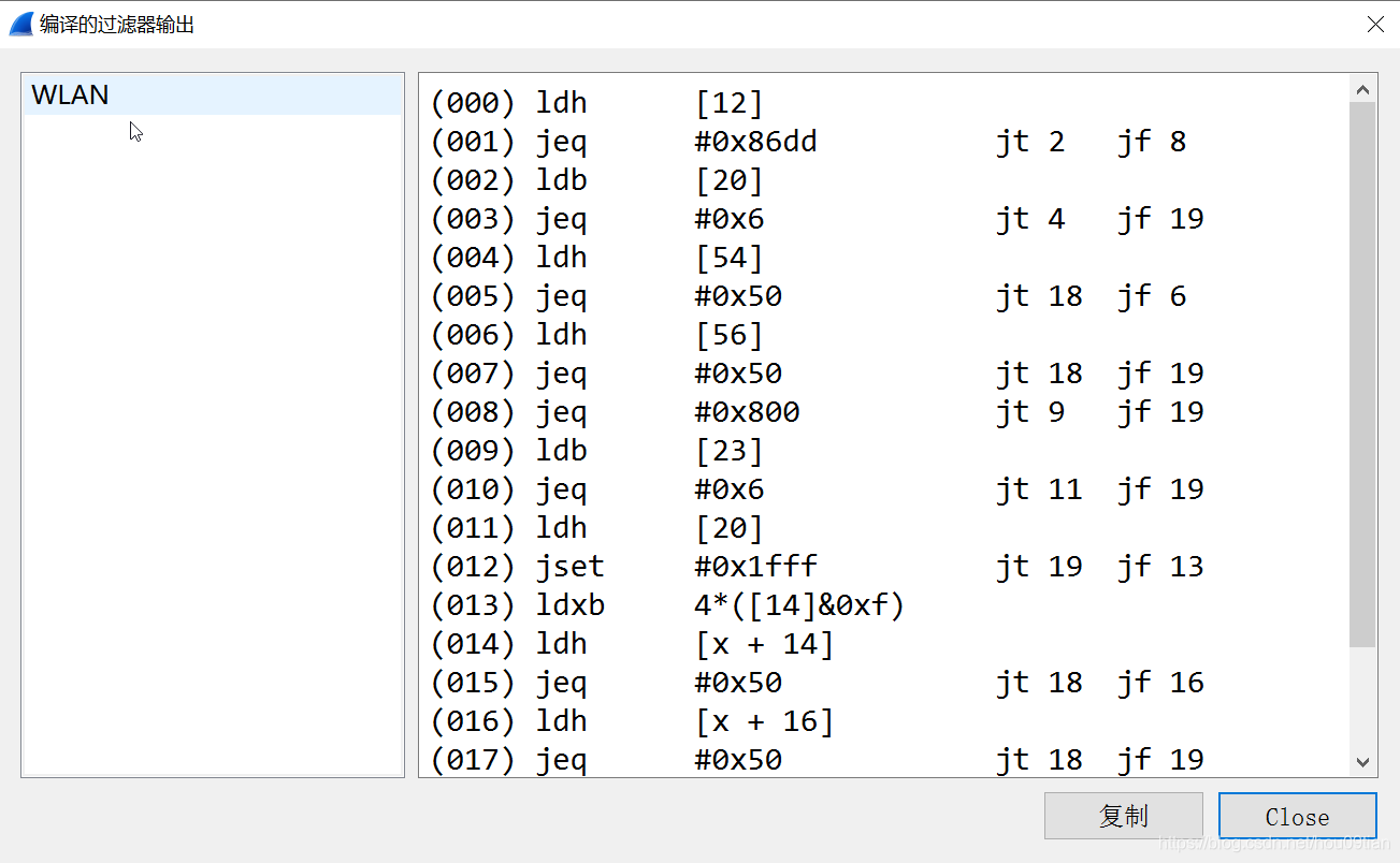 “Compile BPFs”的意思是“编译BPFs”,点击该按键,显示如图8所示的“编译的过滤器输出”对话框。