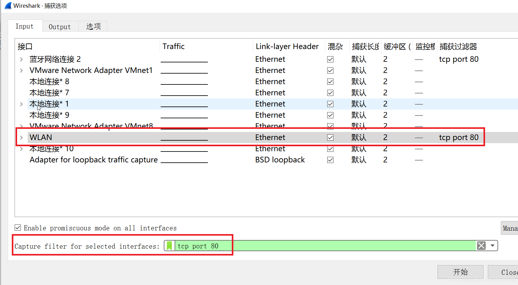 从图7中可以看到,首先在网卡接口列表中选中要设置的网卡接口,之后输入捕获过滤语句“tcp port 80”,点击“开始”按键之后,在WLAN上只捕获在80端口上的TCP数据包。