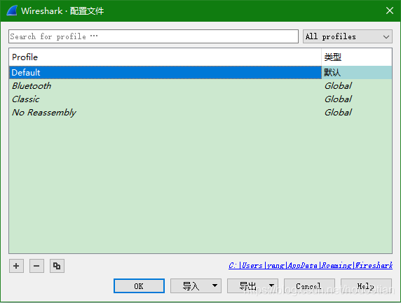 从图9中可以看出,“配置文件”对话框的上部是一个搜索配置文件的输入框,通过输入配置文件的名称来对配置文件列表中的文件进行搜索;输入框的右侧指定了要搜索文件的类型,其下拉菜单中有“All profiles”、“Personal profiles”和“Global profiles”三项,分别表示“所有配置文件”、“个人配置文件”和“全局配置文件”。其中,“个人配置文件”保存在用户的配置文件目录中,为指定用户使用;“全局配置文件”由Wireshark软件自带,所有用户都能使用;“所有配置文件”是“个人配置文件”和“全局配置文件”的总和。