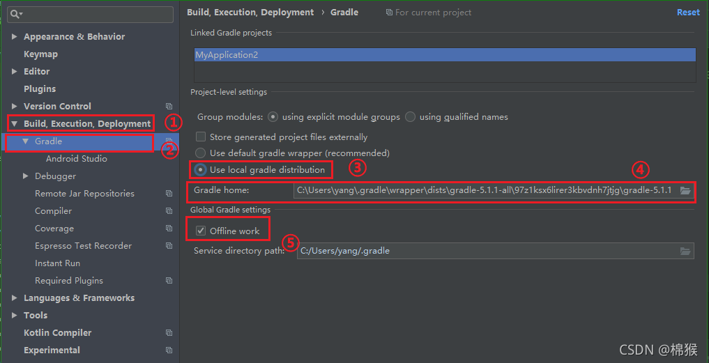 选择Android Studio的工具栏“File->Setting”,之后,在弹出的Setting对话框中选择“Build,Execution,Deployment->Gradle”,在右侧选择“Use local gralde distribution”,表示使用本地的gradle来构建项目,并且在“Gradle home”中指定“2 在本地找到已经下载的gradle”中提到的本地gradle位置,最后选中“Offline work”选项,即支持离线操作,如图3所示。