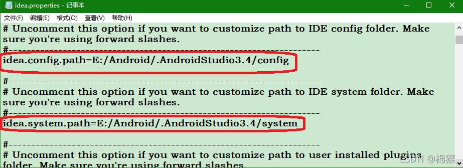 在将.AndroidStudioX.X文件夹移动到“E:\Android\”之后,还需要对idea.properties文件进行修改。