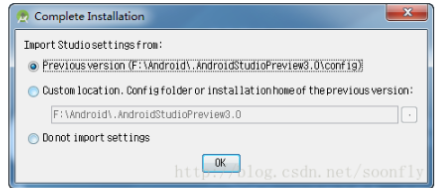 图6中的提示框的作用是选择导入设置文件的方式,在此选择第一种,即从我们已经移动到新位置上的.AndroidStudioX.X中导入设置文件,点击“OK”按键即可。