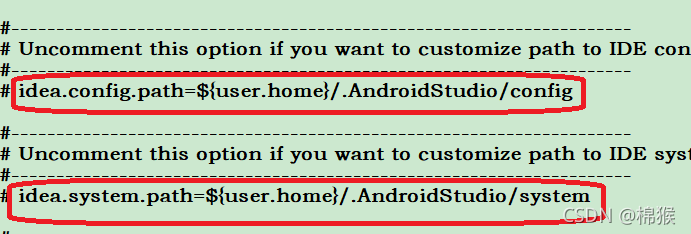 需要注意的是,需要把文件中的“idea.config.path”和“idea.system.path”键前面的“#”去掉。