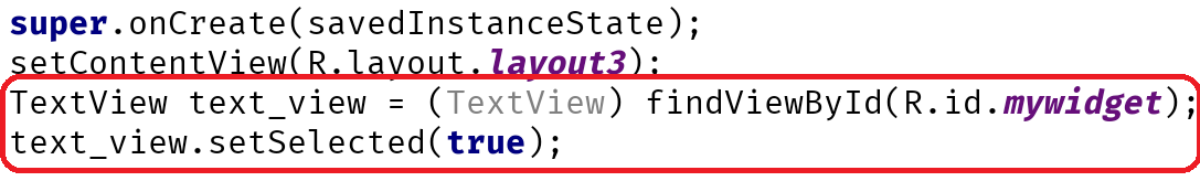 其中,findViewById()方法的作用是通过指定的视图ID找到视图,R.id.mywidget即为用于跑马灯显示的TextView的ID,text_view即为找到的视图;setSelected()方法的参数是true时表示将视图设置为被选中。