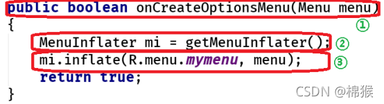 图8③通过MenuInflater类的对象mi,调用inflate()方法将菜单XML文件实例化成菜单对象。该方法的第一个参数XML文件的ID,R.menu.mymenu即为在“1.2 创建菜单文件”中创建的菜单文件;第二个参数转换后的菜单对象,menu是onCreateOptionsMenu()方法的参数,如图8①所示。图8③代码的作用是将菜单ID,R.menu.mymenu实例化成的菜单对象menu。