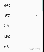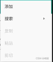 正常的选项菜单如图3所示,而执行了setGroupVisible()方法后的菜单如图4所示,可以看到,在同一个group下的菜单项“复制”、“剪切”和“粘贴”同时被隐藏了。