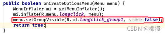 从图2中可以看到,setGroupVisible()方法的第一个参数即为指定group的ID,R.id.longclick_group1即为图1中指定的group的ID;第二个参数表示隐藏或者显示菜单项,true表示显示,false表示隐藏。