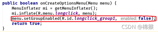 setGroupEnabled()方法的作用是使得指定group中的菜单项变得可用或者不可用。在onCreateOptionsMenu()方法中添加如图5所示的代码。