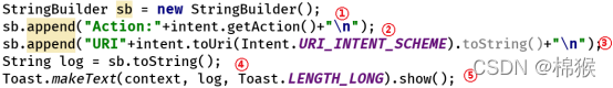 其中,通过StringBuilder类的对象sb(图4①)构造一个字符串,该字符串中包含了收到广播消息对应的动作(图4②)和数据(图4③),最后将sb转换为字符串(图4④)并通过Toast显示(图4⑤)。