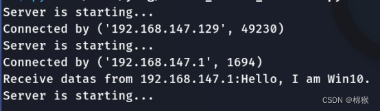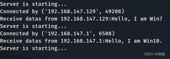 从图2中可以看出,经过改良后的服务端,可以和IP地址为“192.168.147.129”的Win7通信,也可以与IP地址为“192.168.147.1”的Win10通信。通信完成后,继续等待其它客户端的连接。
