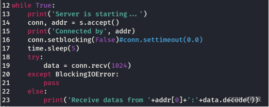 从图6中可以看出,第16行代码调用setblocking(),该函数的参数是False时表示非阻塞模式,True表示阻塞方式;也可以使用settimeout()函数,该参数表示等待时间,0.0表示等待0.0秒即不等待,代码直接向下运行;第17行代码指定了等待时间,也就是说,当前连接的客户端如果在5秒钟之内不发送数据,则服务端不再等待。