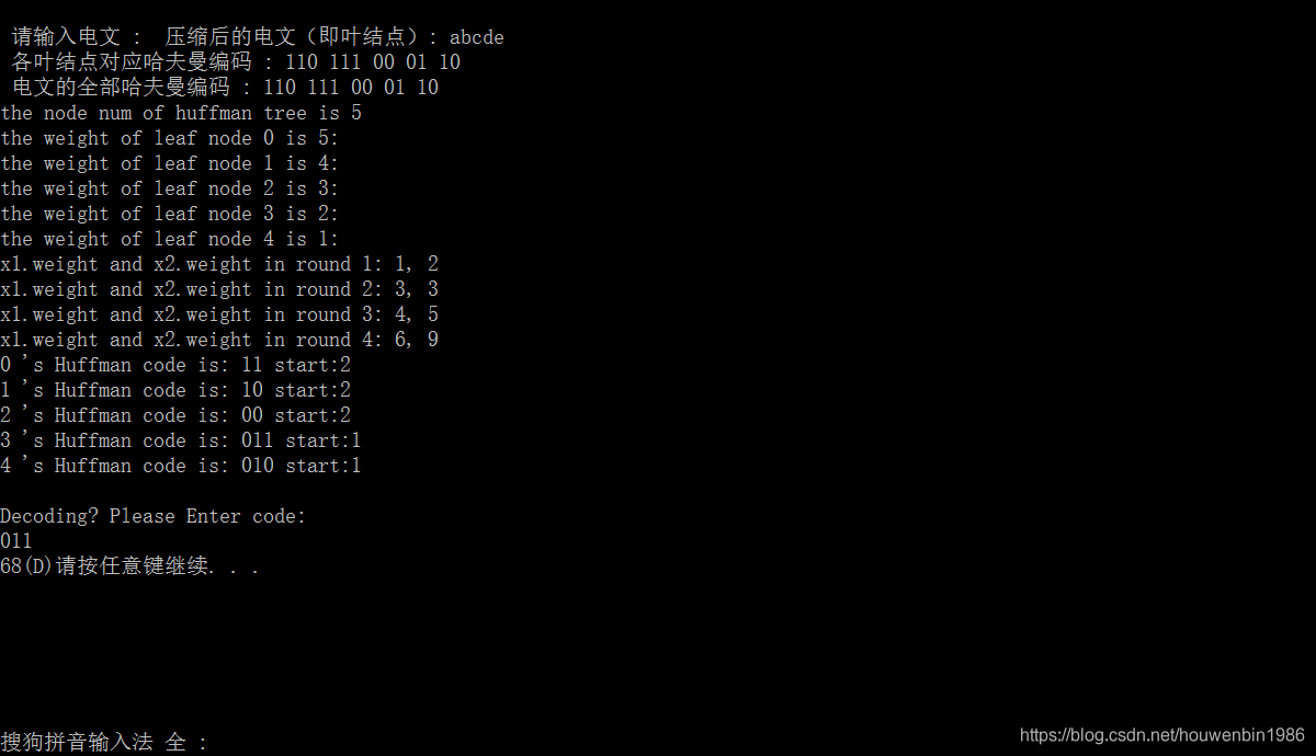 printf("\n 电文的全部哈夫曼编码 : ");/*输出电文的全部哈夫曼编码*/
