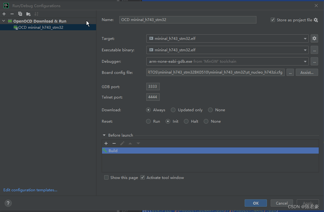 Board config file: 点击Assist 选择最接近的,以h743为例,选择st_nucleo_h743zi.cfg