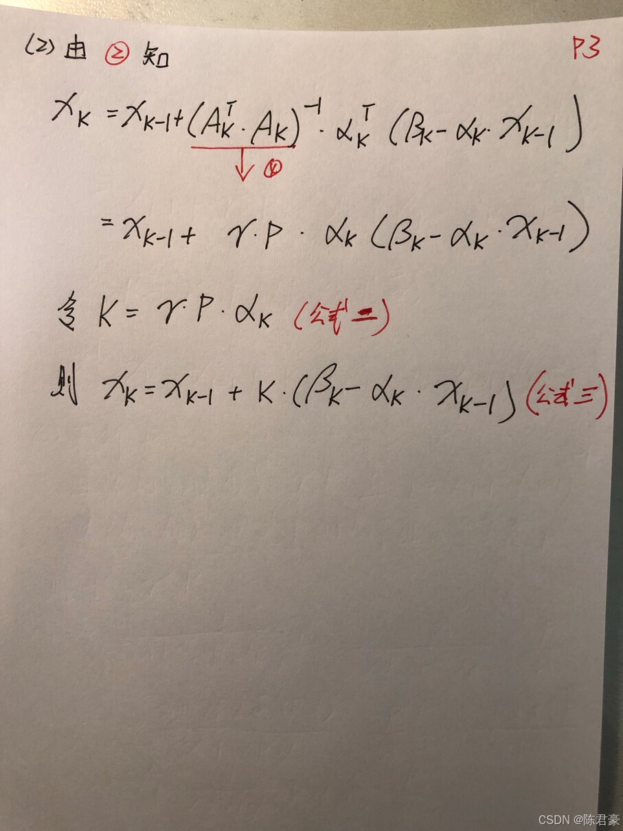 double gamma = 1 / (rho2_ + thr * P_ * thr); //公式一 double K = gamma * P_ * thr; //公式二 thr2acc_ = thr2acc_ + K * (est_a(2) - thr * thr2acc_); //公式三 P_ = (1 - K * thr) * P_ / rho2_; //公式四