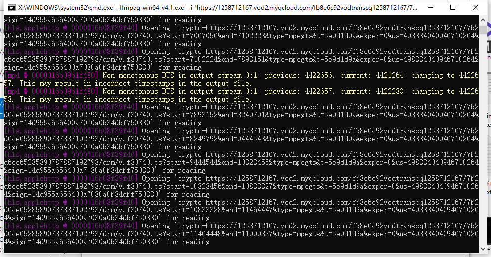 ffmpeg-win64-v4.1.exe -i "https://1258712167.vod2.myqcloud.com/fb8e6c92vodtranscq1258712167/7b2d6ce65285890787887192793/drm/voddrm.token.dWluPTg2MzY2MzczODt2b2RfdHlwZT0wO2NpZD0yMzE1Nzc7dGVybV9pZD0xMDAyNzMxNjk7cGxza2V5PTAwMDQwMDAwMzUzNTA5OTNhODhjYjBlNmM5MzM0NTZhNmY0NGQ3ZmQzZWU0OTczY2U0MDk5YmQ5ODIzYzFiOGMwY2FkZjQxNjhkNzBjN2EzYWEwOGI0Yzg7cHNrZXk9.v.f30740.m3u8?t=5e9d1d9a&exper=0&us=498334040946710264&sign=14d955a656400a7030a0b34dbf750330" -c copy 自定义文件名.mp4