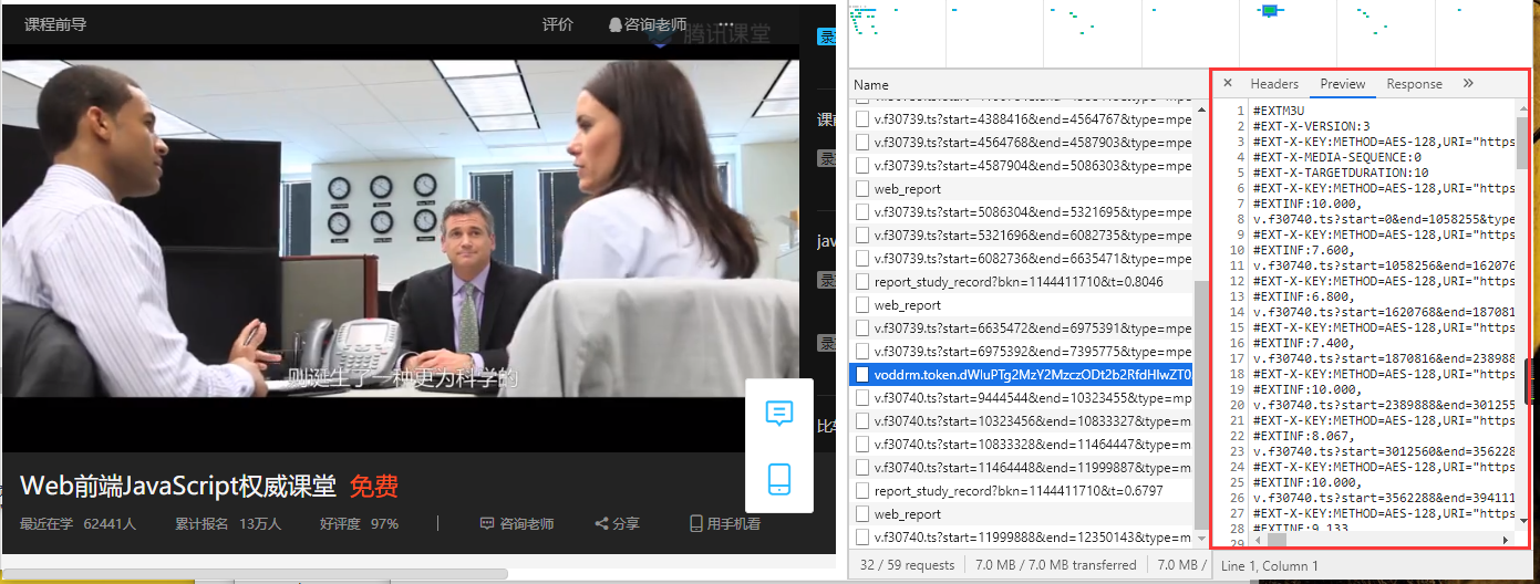 1、下载步骤:进入播放界面,按F12打开浏览器调试模式,找到视频播放请求:在Network面板找到.m3u8文件请求地址,.m3u8文件内容格式如下图所示: