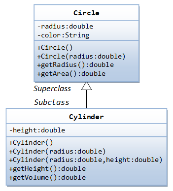 在这个例子中,我们从父类Circle派生一个子类叫做Cylinder,可以看到,我们重用了Circle类,重用性是OOP中一个非常重要的属性,Cylinder继承了Circle类的所有属性(radius 和 color)和方法(getRadius(), getArea()以及其他),另外,它自己定义了一个属性height,两个公有方法getHeight() 和 getVolume()以及它自己的构造器。