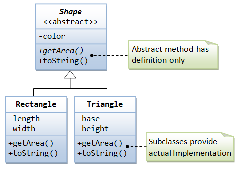 例如:在Shape类中声明了三个抽象方法methods getArea(), draw()。