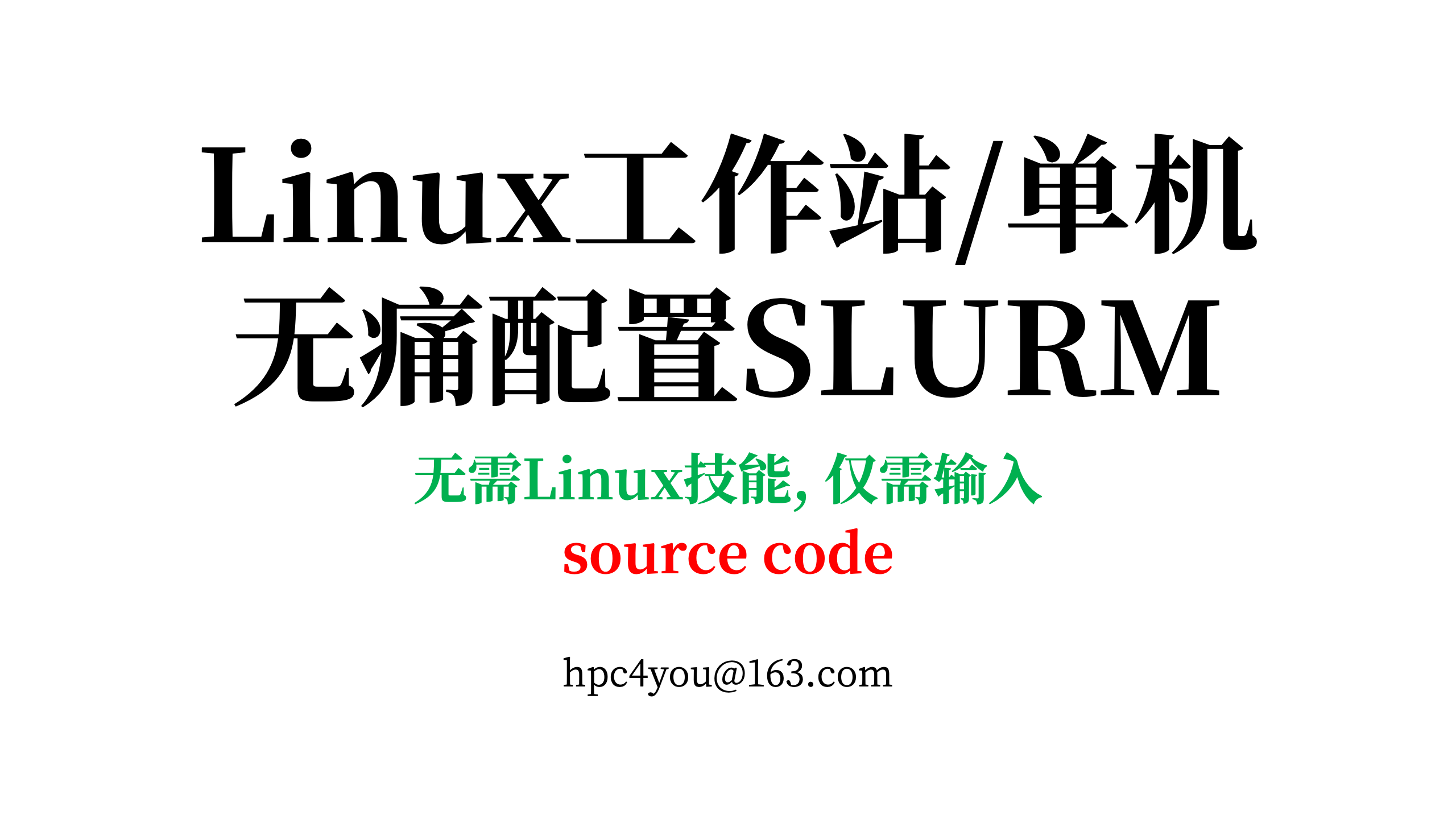 简介hpc4you toolkit solo,适用于在Linux单机/工作站, 一键自动配置SLURM调度器 支持RHEL7和RHEL8及其兼容系统(比如CentOS 7.x, 8.x, Rocky Linux 8.x等) 支持Ubuntu 20.04和22.04系列及其兼容衍生版本.如何使用将文件code和压缩包hpc4you_toolkit-solo*.tgz放在目标服务器上 在以上两个文件所在路径, 打开终端, 输入指令 source code 耐心等待, 调度器自动就绪...