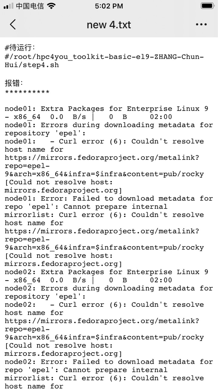 和固执的外行很难交流。 hpc4you _toolkit教育优惠价,前提是自助模式,自助模式就是拿到工具后,按照手册自行操作,我不提供任何技术支持。 手册也有提到前提条件之一是确保apt/dnf/yum 工作正常。 这几天,某高校的教授,来回烦我。就说工具一直保存,无法使用。 保存截图如下。 我说你没有确保dnf 正常工作呀。 访问epel有故障,不是他机器网络故障,就是其他网络故障,或者上级软件源抽风。根据我的经验,可能是对方手动修改epel给搞错了地址。
