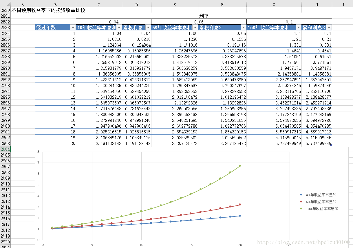 年利率差2个百分点,20年后的收益率相差不是40个百分点,而是近一倍。相差8个点,不是1.6倍,而是近6倍。 指数增长的威力可见不一般。 然而,这只是一个简单而美丽的曲线;人生不是一条直线,也不是一条单调增长的曲线