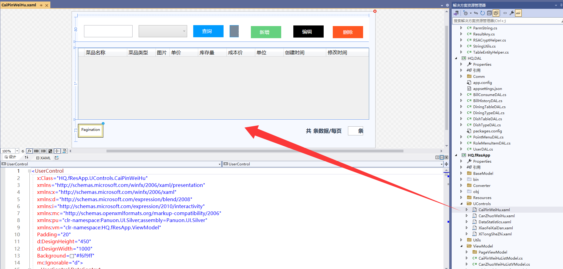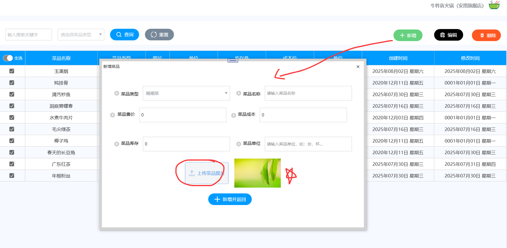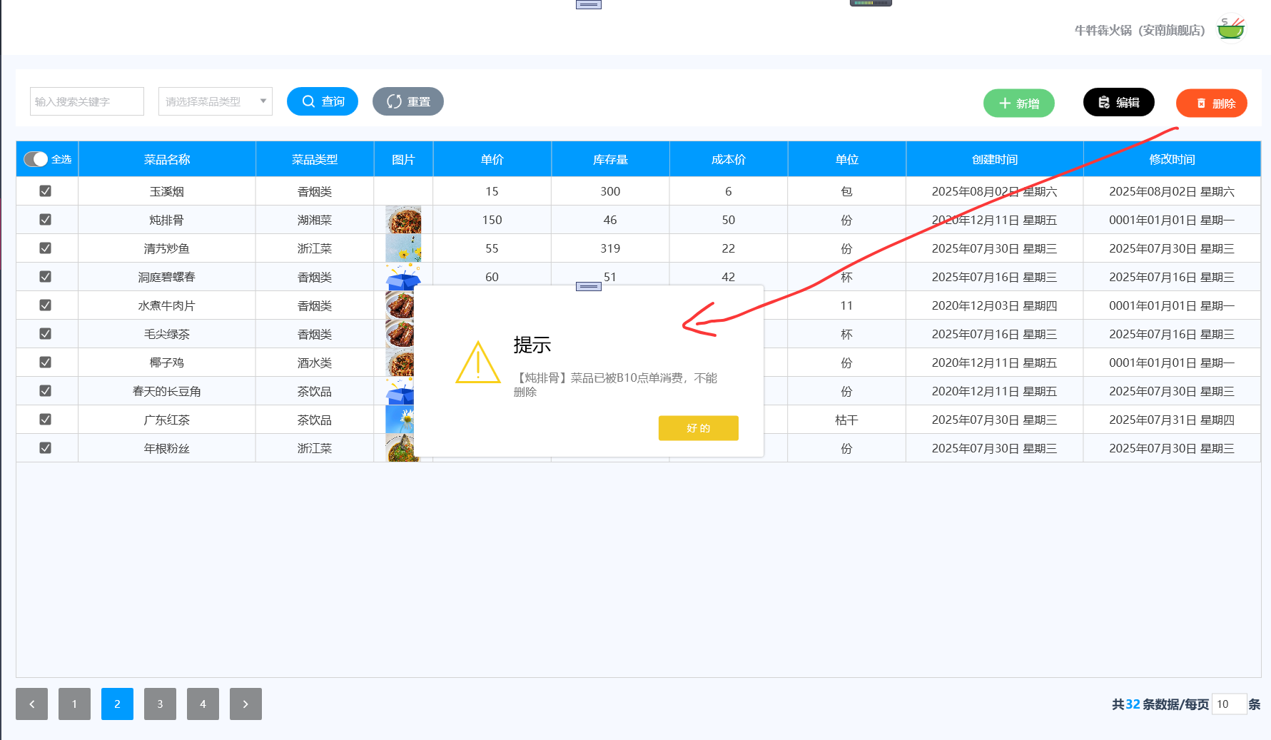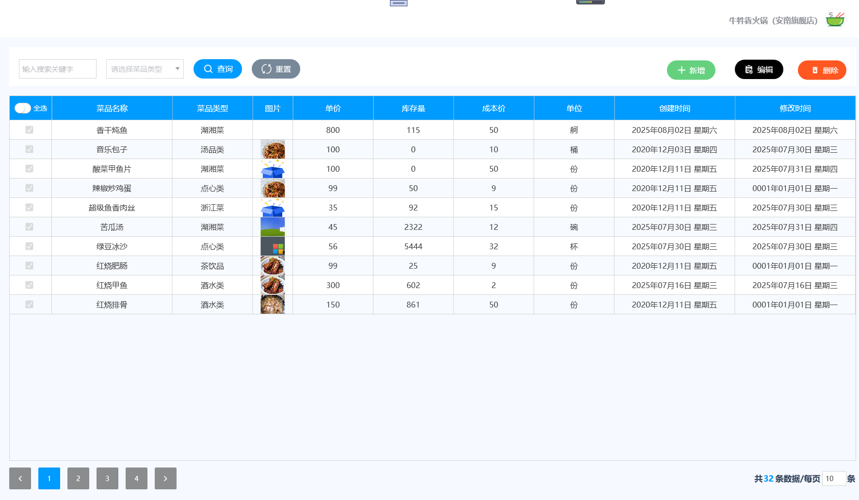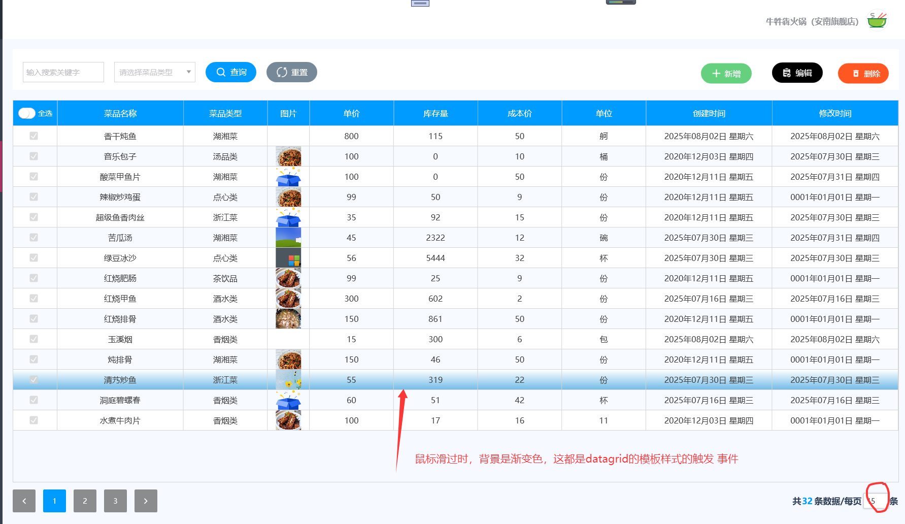 菜品维护模块的功能与餐桌维护的功能一样的,包括有:全选,分页,新增,删除,修改,列表展示